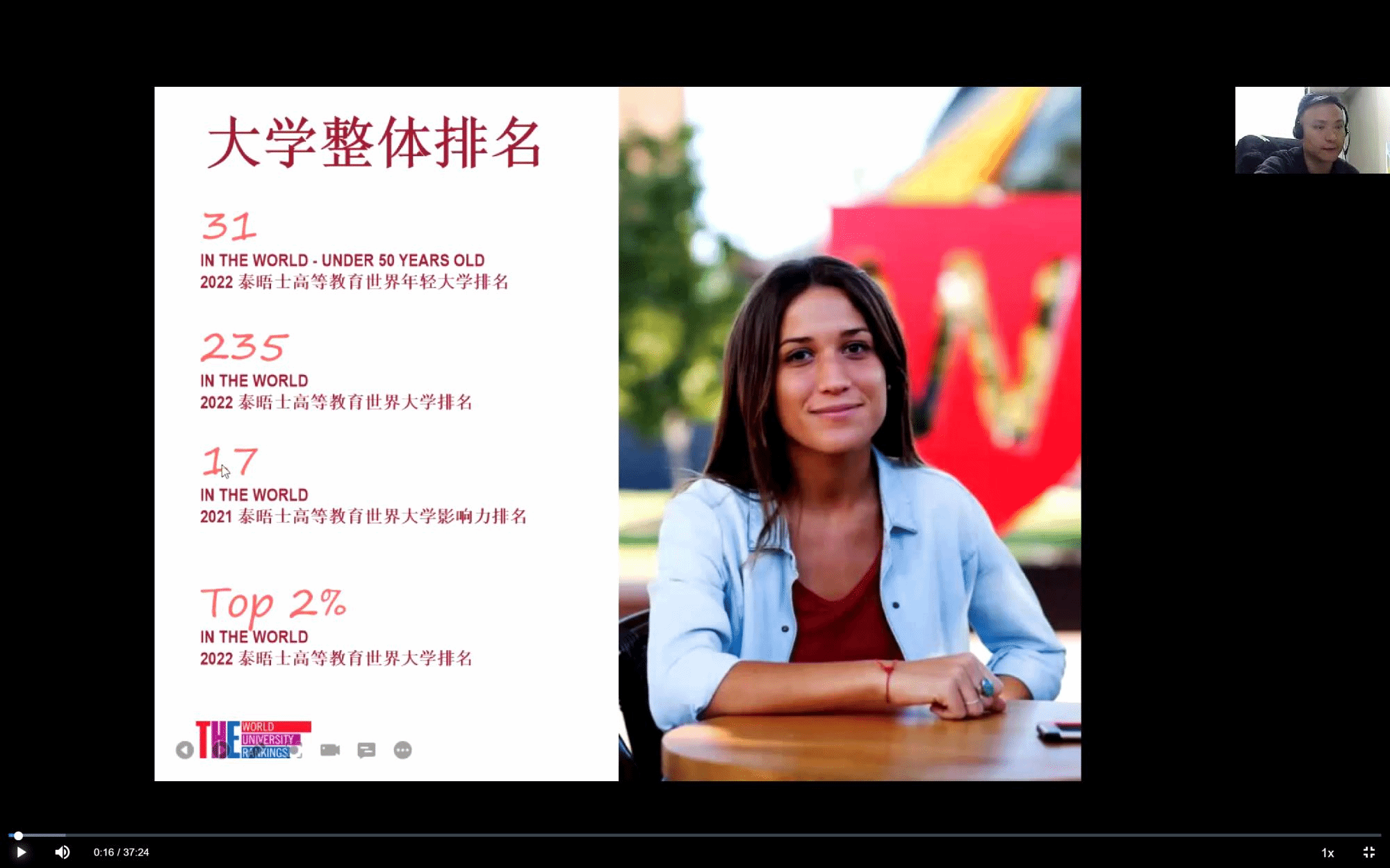 首先,张业钒老师以自己在澳大利亚多年来生活的角度,给同学们简要地介绍了澳大利亚的风土人情、主要城市,以及当前全球疫情下澳大利亚的防疫措施和出入境政策。接着切入到了西悉尼的地理位置,开始重点介绍西悉尼大学的校区分布、古老风韵的建筑、如梦如画的校园环境。更有泰晤士高等教育世界大学影响力排名17、2022年泰晤士高等教育世界年轻大学排名31等傲人的成绩。