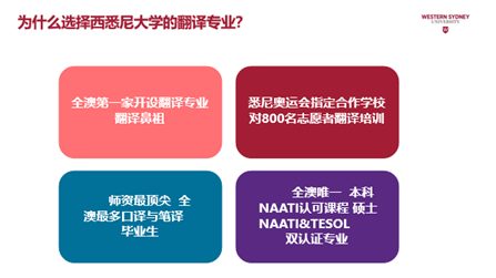 在正式讲座开始之前,Vincent Cheung WSU向我们介绍了有关西悉尼、西悉尼大学以及西悉尼大学的翻译专业。悉尼是澳大利亚最大的城市,而西悉尼是澳大利亚第三大经济区,会有新增的数以万计的就业岗位。此外,西悉尼大学在世界大学影响力排行榜第十七、世界年轻大学第三十一,是一所QS五星的大学。西悉尼大学的翻译专业也是西悉尼大学的王牌专业。