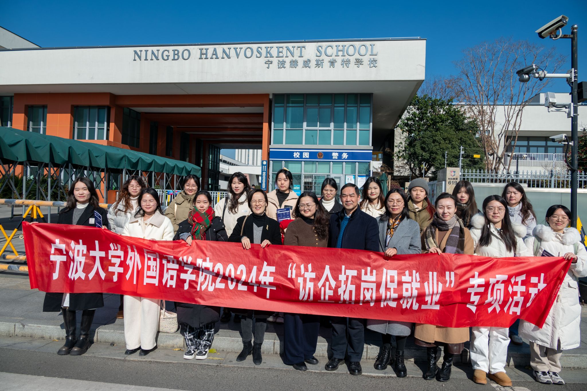 党委书记翁华星、党委副书记胡佳、英语系副主任李奕、学生代表等二十余人赴宁波市镇海赫威斯肯特学校开展“访企拓岗促就业”专项活动。宁波市镇海赫威斯肯特学校校长徐未华、副校长舒建东、校办主任杨晶、校办副主任陈瑶亲切接待。双方签署战略合作协议,并进行教学实习基地授牌仪式。