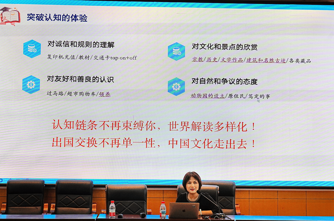 随后,曾带队海外交流、拥有丰富国际学习经验的梁虹副教授围绕“为何要走出去”展开深入分享。她结合个人在瑞典、美国、澳大利亚等地求学与带队经历,从“跨越课堂的学习”“突破认知的体验”两方面入手,以生动的故事阐述了跨文化环境中英语应用、认知转变、自我认同与文化输出的深刻意义。她勉励同学们打破舒适区,在真实的国际语境中锻炼语言能力、提升自我认知,成为讲好中国故事的文化使者。
