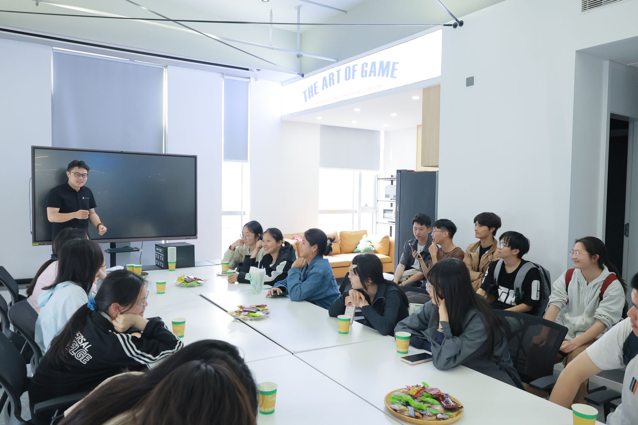 活动尾声,CEO杜伟伟与人事负责人郭辛、人事经理王伯涛带领师生参观企业办公环境,讲解部门职能及主营桌游产品,并就实习就业相关问题进行现场答疑,同学们参与了一对一面试环节。
