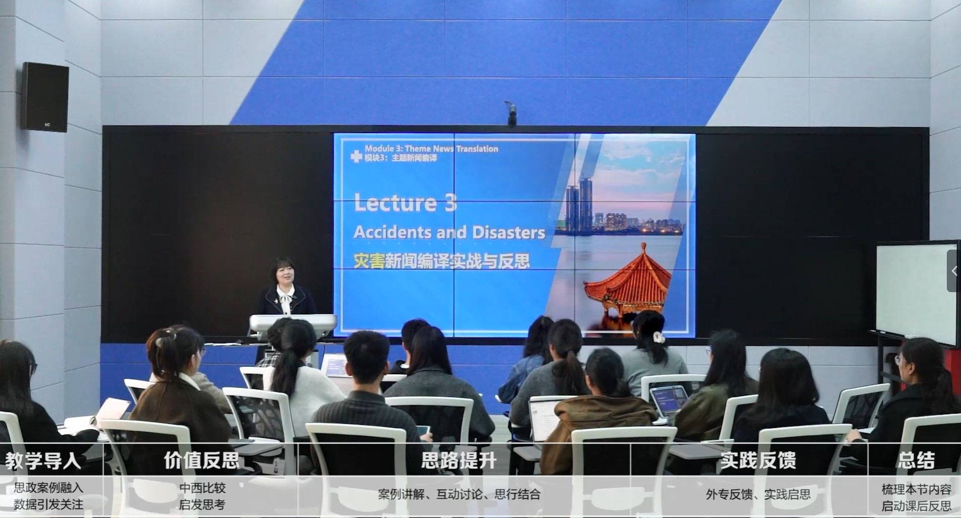 该课程先后获评浙江省省级课程思政示范课程、省级线上线下混合式一流课程,被环球网推荐为新闻编译项目实习生学习资料,配套教材2024年在清华大学出版社出版,获批浙江省“十四五”新文科重点教材。