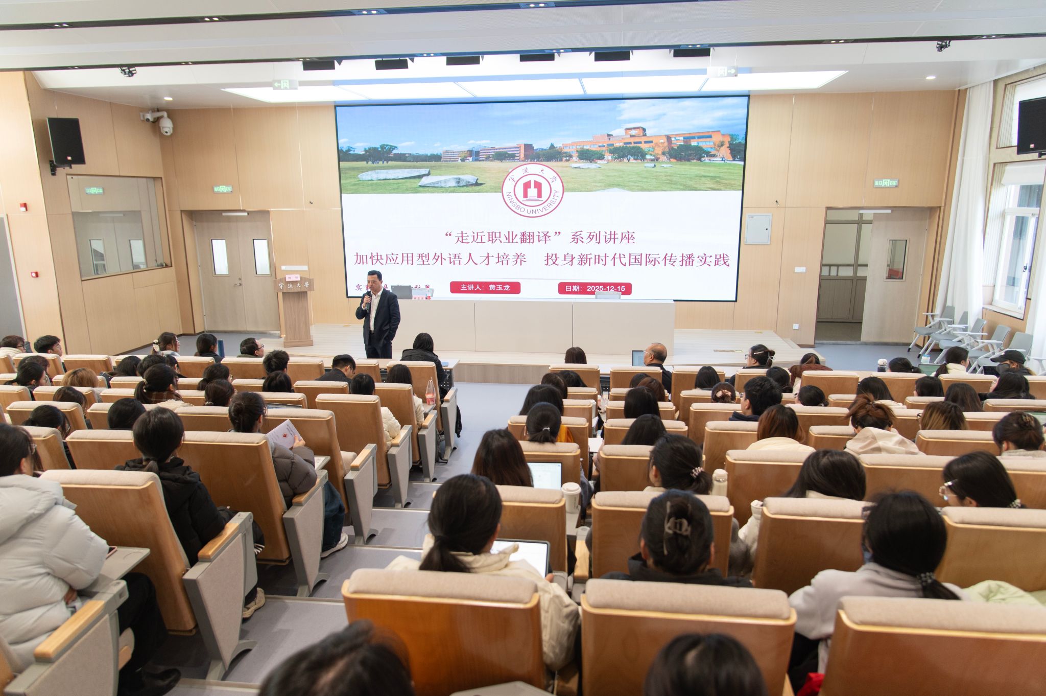 座谈会后,黄玉龙院长以“加快应用型外语人才培养,投身新时代国际传播实践”为题,为外院师生作专题讲座。他以生动活泼的互动形式,阐释了“生态优先、全球共享”的传播理念,并提出“外语是基础、专业是支撑、文化是关键、技术是方向”的四维人才培养框架。宁波市外办翻译中心汪玉琼主任带队出席。学院本科硕士近200人参加讲座。