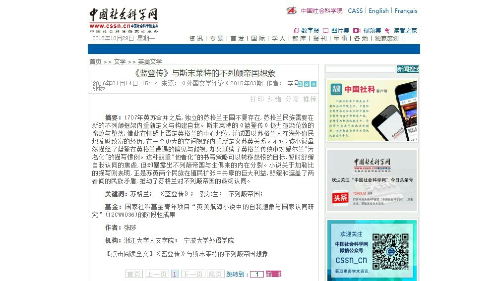 据悉,“‘地球中空说’、南极探险与想象美国的三种方式”是张陟博士主持的国家社科基金青年项目“英美航海叙事中的自我想象与国家认同”的阶段性成果,也是继“《蓝登传》与斯末莱特的不列颠帝国想象”之后,张陟博士的论文第二次获得中国社会科学院网站全文刊载。性吧