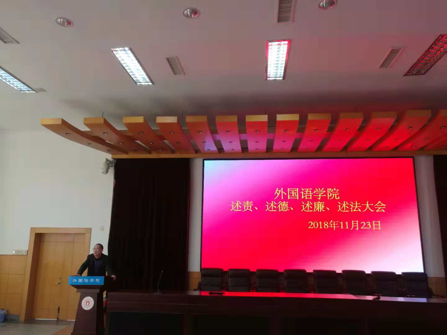 2018年度述责、述德、述廉、述法大会在李达三外语楼218报告厅召开,大会由学院党委书记段汉武主持,学院全体教职工参加了此次大会。