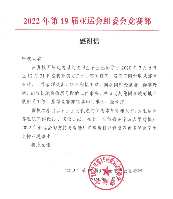 感谢信中写道:石玉玉同学于2020年7月6日至12月31日在亚组委竞赛部实习期间,服从部室安排,工作表现突出,学习积极主动,同事间相处融洽,赢得竞赛部领导和同事的一致肯定。信中还提出“贵校培养出以石玉玉为代表的优秀体育管理人才,为亚运竞赛组织工作做出了积极贡献。非常感谢性吧