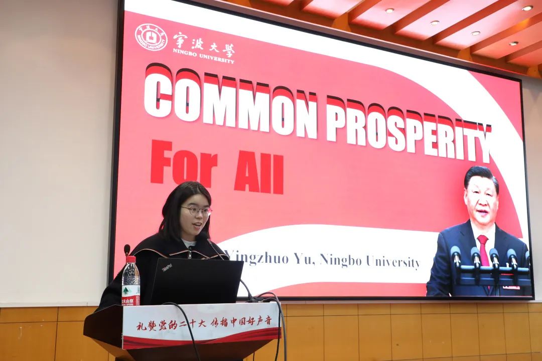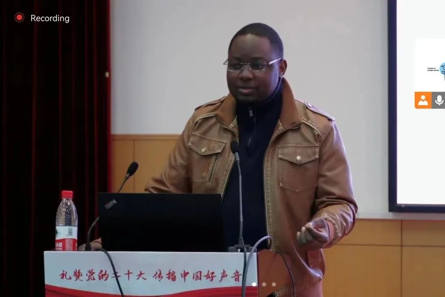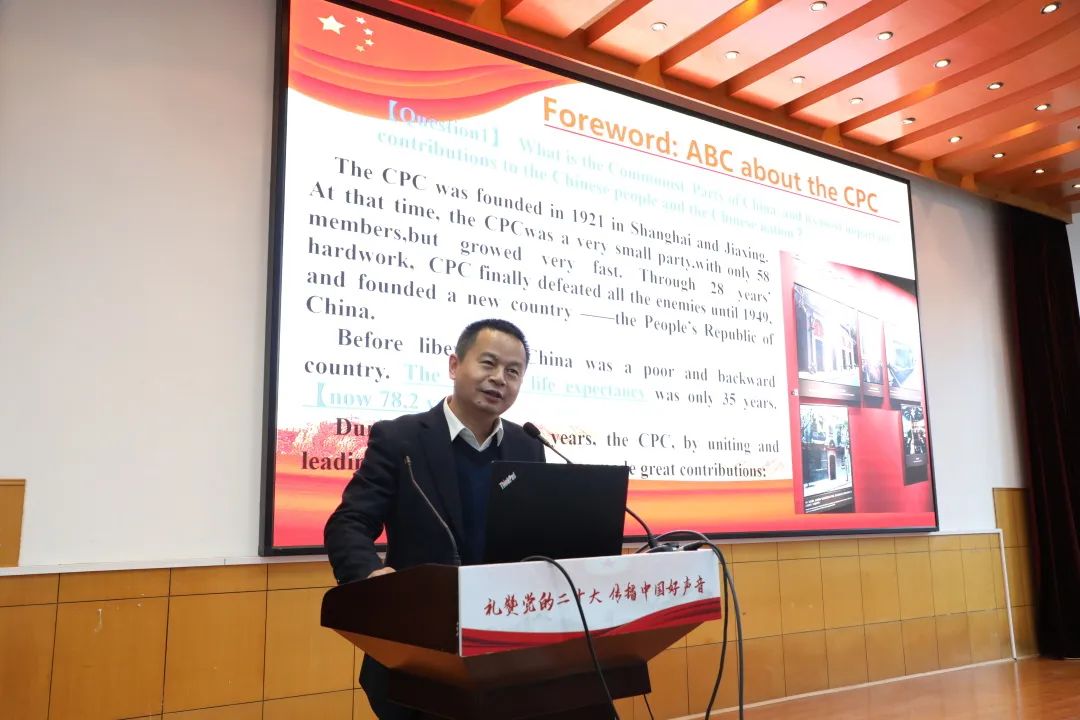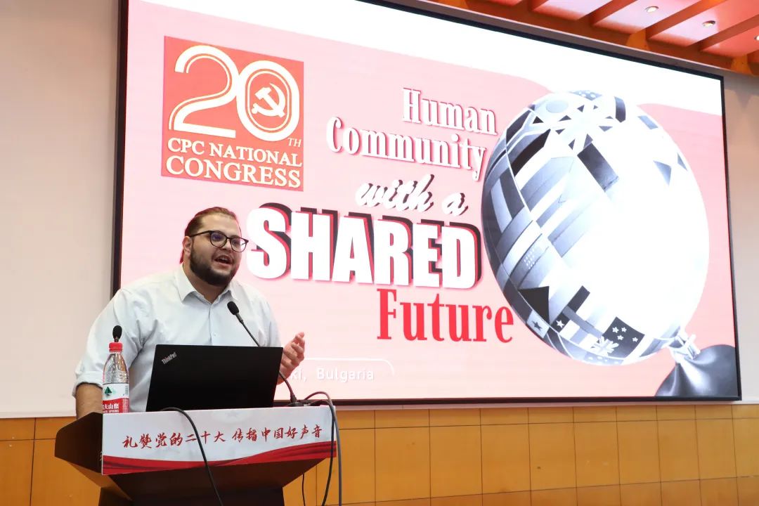 李包庚教授重点介绍了中国共产党及党的二十大的里程碑意义。STOYAN GEGOVSKI (高伟义)从一名欧洲友人的视角分享了他所理解的二十大“人类命运共同体”理念。余颖卓讲述了共同富裕的内涵。UGAANYI JOSEPH(张渊明)阐释了自己对“一带一路”倡议的理解。吴欣莹对“绿水青山就是金山银山”的科学内涵和深远意义进行宣讲。