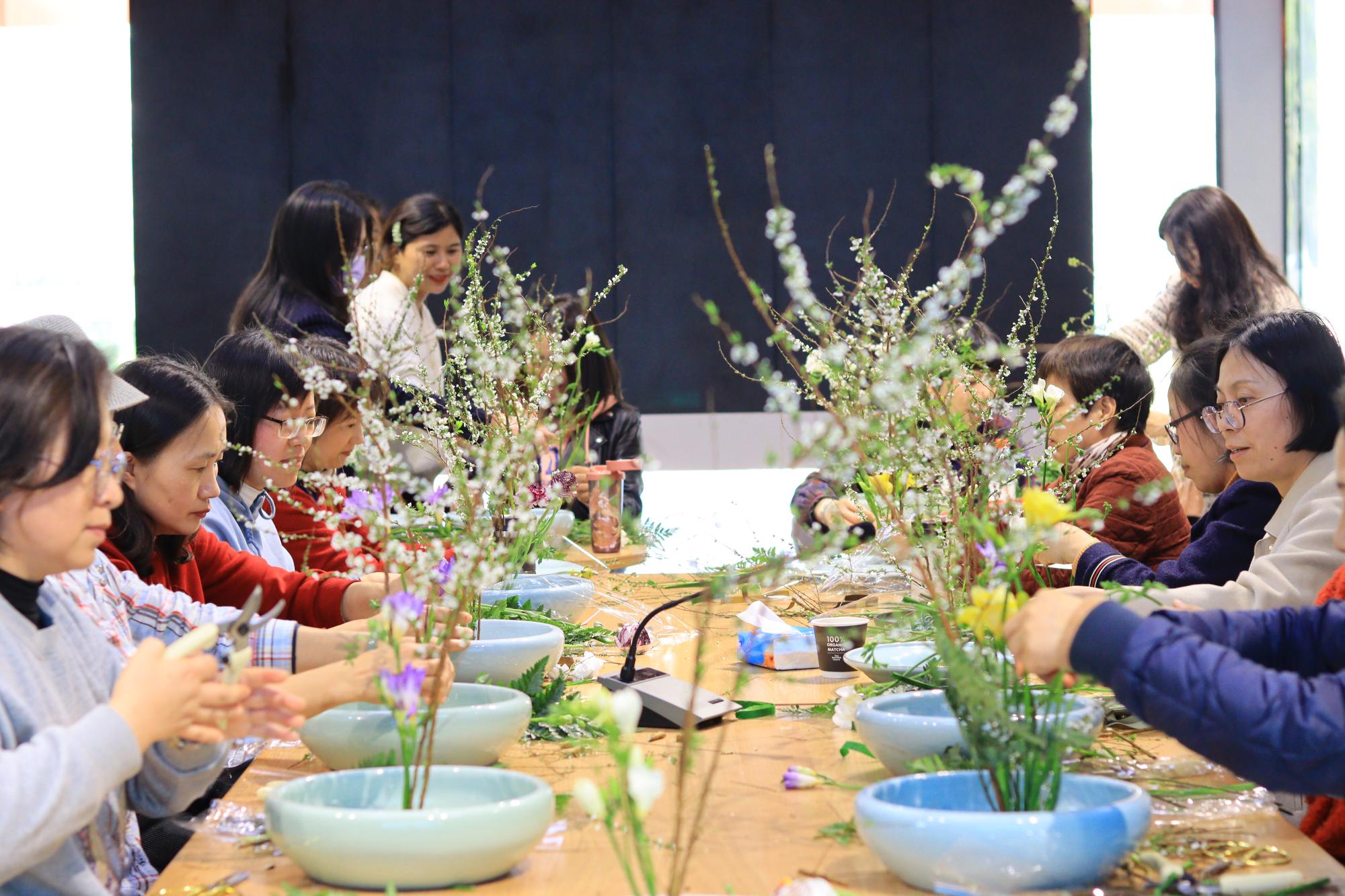 为了让大家更深入地了解中国传统插花艺术,活动专门邀请了中国插花花艺讲师朱淋女士,带领大家体验传统式插花技艺。本次插花的主题为“天地人”,天人合一的传统文化是凝聚人心的强大载体,也是流淌在每一个国人血脉之中的共同情感。大家兴致勃勃地亲自动手剪枝、整理,相互切磋……在全情投入、物我两忘的一番实践后,一个个缤纷生动的插花作品就摆满了活动室,现场其乐融融。