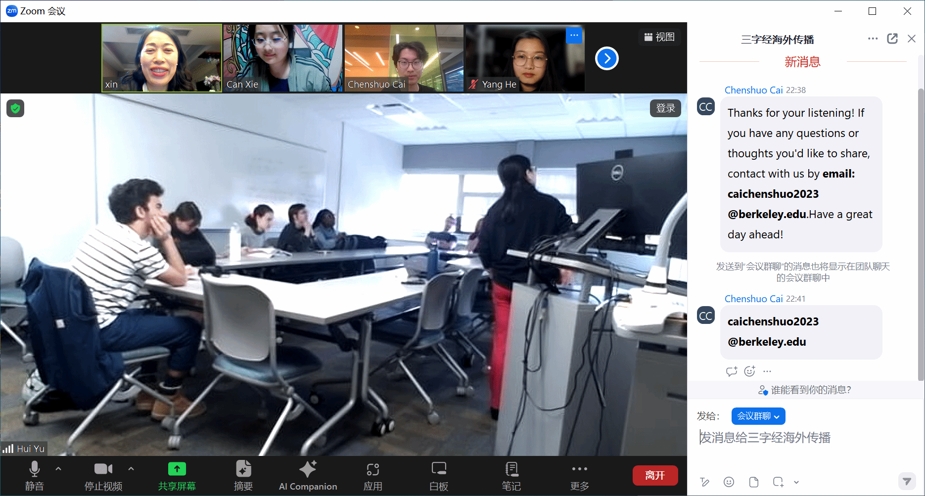 项目组成员谢璨介绍了《三字经》的文本内容、文体风格、文本意蕴及其在中华文明中的价值,带领学习班成员一起学习了《三字经》部分内容,并生动讲解了孔融让梨的故事。整场连线活动聚焦《三字经》,介绍了宁波作为院士之乡的悠久蒙学教育历史,图文并茂、趣味生动。互动环节,肯特州立大学中国语言课程班的同学纷纷表示非常喜欢中国孔融让梨的故事,让他们受益匪浅。“这场活动很有趣,我受益颇多。希望有更多机会和中国的朋友们交流”,学习班成员Johathan在宣讲接近尾声时如是说道,并和项目负责人蔡晨硕交换了邮箱。这场精彩的宣讲不仅带领学员们全面了解了《三字经》别具一格的表现结构、意蕴丰富的文本内容及联通中外的文化影响,还培养了海外学员对《三字经》的鉴赏能力。与会者无不深深感受到浙东蒙学所蕴含的智慧和中国文化的独特魅力。美国肯特州立大学中文项目组负责老师Yu Hui(俞慧)女士热诚感谢 “浙东蒙学国际传播”团队通过联线课堂 “送教来美国”。