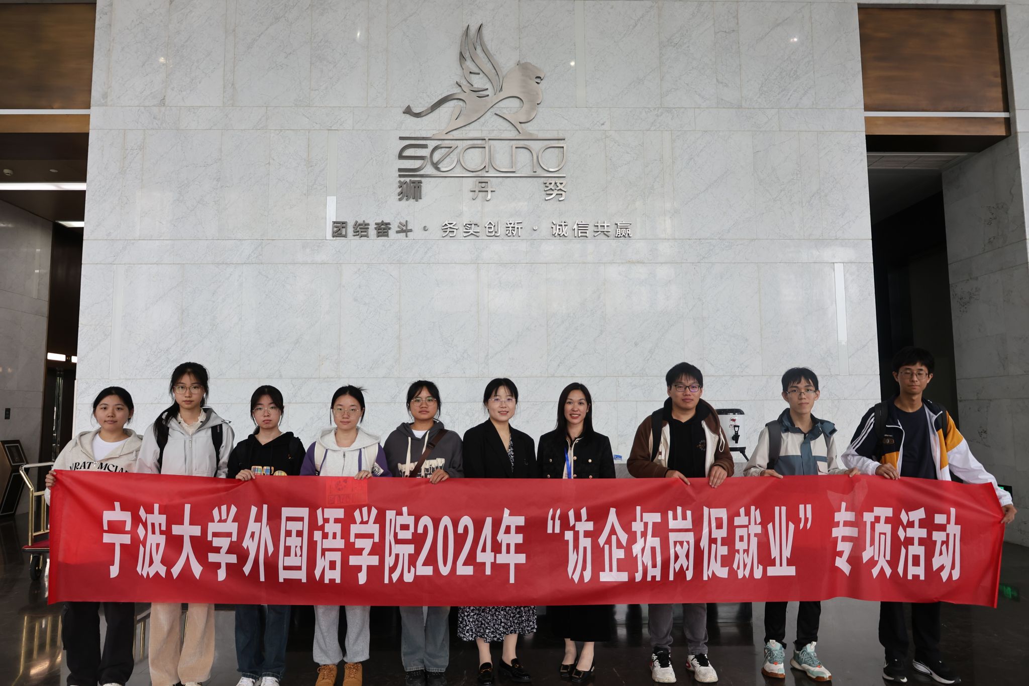 辅导员林晓莉和学生代表十余人赴狮丹努集团股份有限公司开展“访企拓岗促就业”专项活动。集团招聘经理沈苗苗亲切接待。