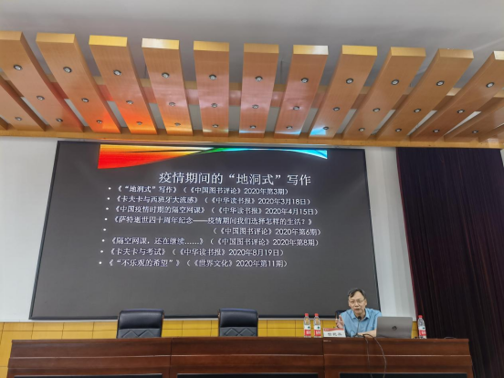 讲座伊始,曾艳兵教授回顾了疫情期间他本人的“地洞式”写作的经历,追溯了卡夫卡“地洞式”写作的缘起,进而阐释了卡夫卡的作品与柏拉图“洞喻说”的联系。接着,曾教授对柏拉图的“洞喻说”进行了细致而深刻的阐述,指出“洞喻说”其本质关涉心灵转向问题。曾艳兵教授引经据典,从柏拉图的 “洞喻说” 到鲁迅的“铁屋子”之说,从《金刚经》的“性空幻有”到海德格尔对人的本质的追问,显示了宽广的学术视野和深厚的学术底蕴。整场讲座深入浅出,风趣幽默,观点令人耳目一新,在场师生获益良多。