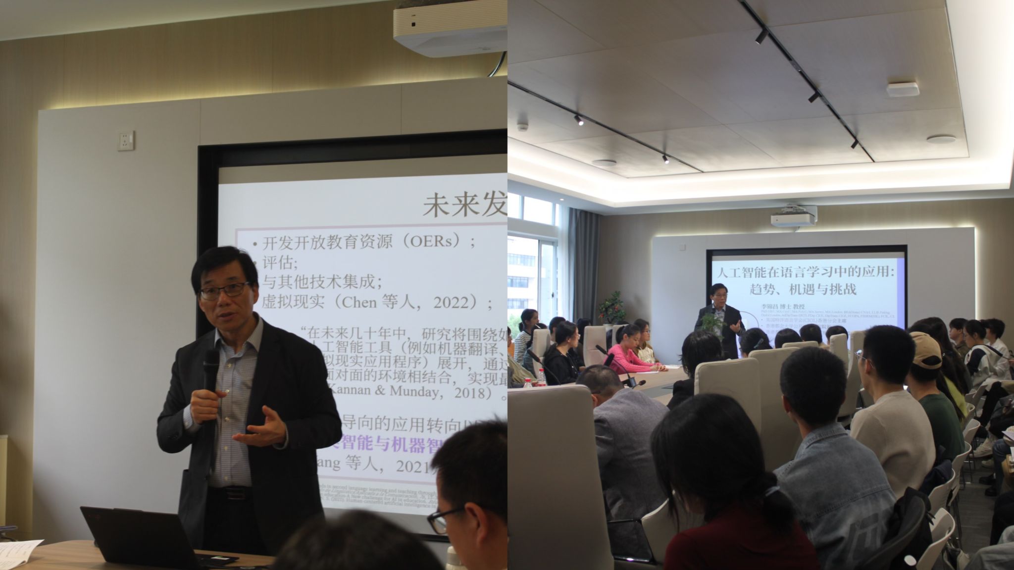 10月21日,香港都会大学公开进修学院李锦昌院长一行到访性吧 ,就加强香港都会大学公开进修学院与性吧 之间的合作与交流,进一步推动教学科研、跨学科合作研究开展座谈交流。性吧 相关负责人,外事办公室负责人接待并参加座谈。学院负责人对香港都会大学公开进修学院李锦昌院长一行表示热烈欢迎,详细介绍了性吧 在学科发展、师资力量和人才培养等方面的成果,特别介绍了学院在线上教学与实践方面做出的努力和取得的成果。香港都会大学公开进修学院李锦昌院长介绍了香港都会大学的发展历史以及公开进修学院的概况,并表示希望与性吧 外国语学院深入合作交流,共谋发展。与会人员围绕召开国际会议、国际交换生项目等内容深入交流并初步达成一致。会后,李锦昌院长做了题为“人工智能在语言学习中的应用:趋势、机遇与挑战”的讲座,学院80余名师生参加,会场内座无虚席,气氛热烈。讲座伊始,李锦昌院长指出随着ChatGPT等生成人工智能(GenAI)的出现,语言学习开始经历继20世纪90年代互联网兴起后的又一次变革,如何更好的应对是当下外语人亟待解决的问题。首先,生成式人工智能作为语言教育中个人导师的功能,可以提高学习动机和自信心,减少学习焦虑、高效总结复杂文本并收集相关信息;其次生成人工智能可以通过提出建议,即时对话等优势,促使学习者和导师、一对一或者是群体的互动;生成人工智能还有其他特点,包括泛在性、自动化带来的效率、可扩展性和包容性。讲座最后,李锦昌教授总结在语言学习中使用人工智能的一些挑战,包括可靠性、教师和学生的接受度、以及相关的道德问题,并对未来的发展方向进行探讨。教师应在干预和配置人工智能支持的学习中发挥关键作用,并融入教学设计中,将人工智能与其他教学技术相结合,作为教学法的一部分。主讲人简介:李锦昌,教授,现任香港都会大学公开进修学院院长,并兼任该校开放与创新教育研究所总监,推动及带领创新模式开放教育研究,兼任英国国立密德撒斯大学客座教授,担任该校专业研究博士课程顾问,并在两所大学指导多位博士生研究。此外,亦获多所院校(包括河北社会科学院及河北经贸大学等)委任为客座教授。李锦昌教授活跃于学术和专业界,现为英国特许语言学会(Chartered Institute of Linguists,简称CIOL)香港分会主席。曾作为顾问参与广泛的研究及训练计划,并担任多个专业团体委员会的重要成员。
