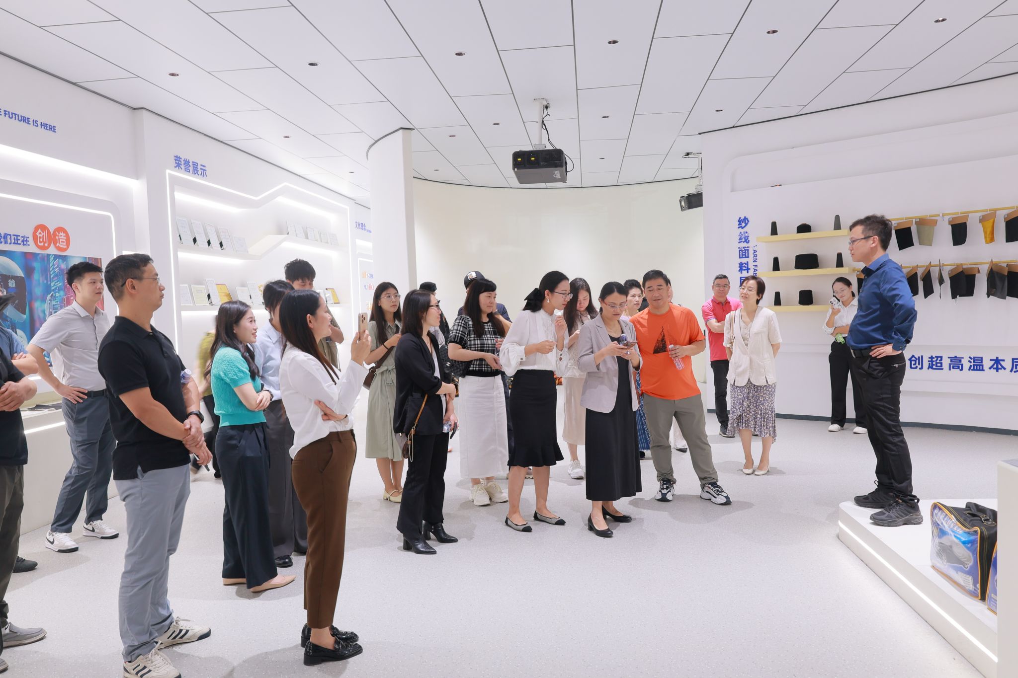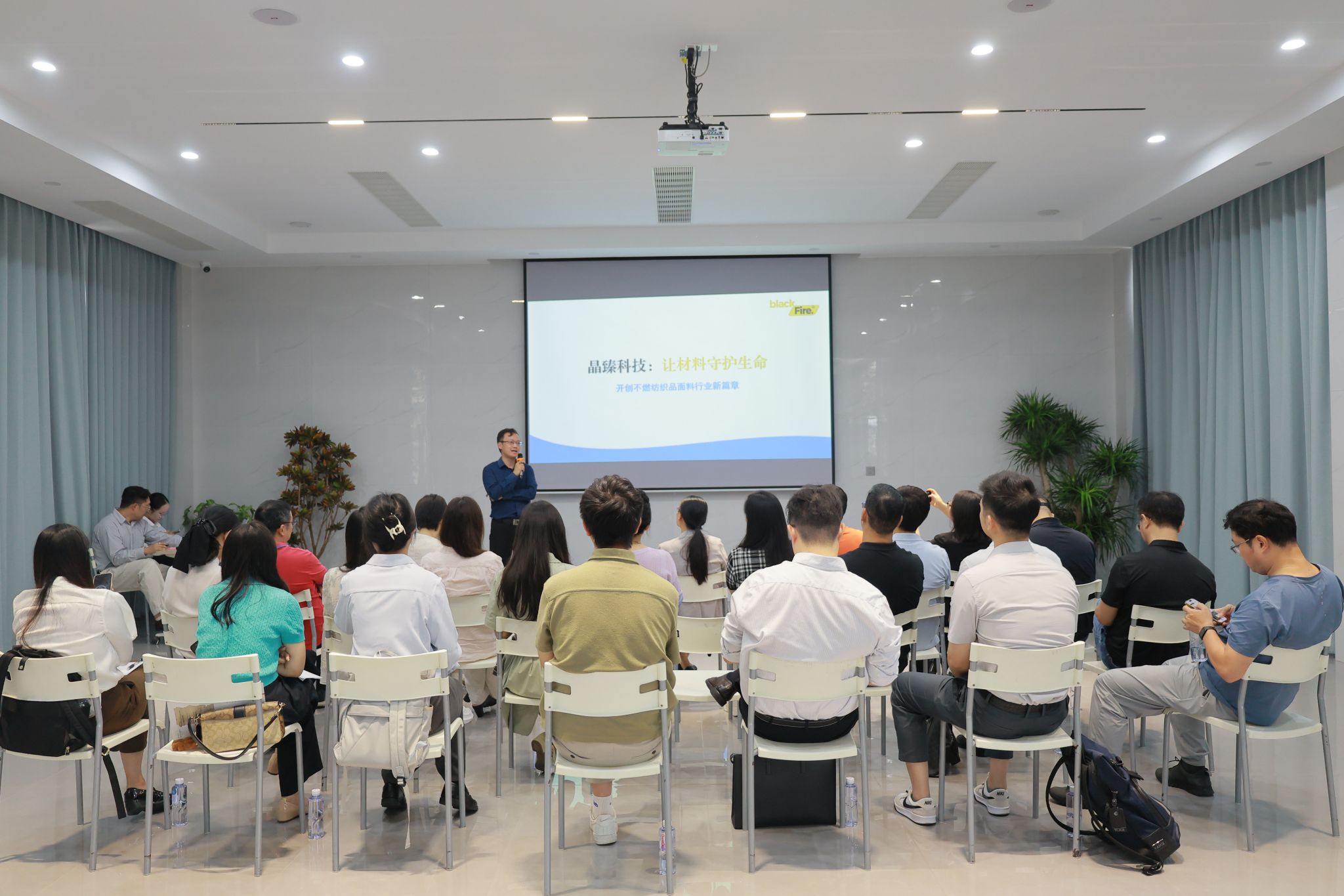据介绍,晶臻科技长期深耕超高温碳纶不燃材料领域,历经数年技术攻坚,成功研发出可耐 1800℃高温的不燃面料,不仅打破了国外在该领域的技术垄断,更构建起覆盖材料研发、生产、应用的完整自主知识产权体系。目前,公司产品已广泛应用于国防军工、消防应急、建筑安全、船舶制造、化工防护等关键领域,并在浙江余姚建成标准化生产线,凭借过硬的产品品质获得韩国、日本及国内权威机构的高度认可,形成“研发 + 制造 + 营销 + 服务”一体化的成熟运营模式,以颠覆性技术推动行业升级,朝着“打造世界级新材料领军企业”的目标稳步迈进。现场,邢斌还结合实物展示,详细介绍了碳纶材料在消防服、军工防护装备、新能源产业耐高温部件、工业劳动保护等场景的具体应用,让参访人员直观感受到“跨界创新”的力量。