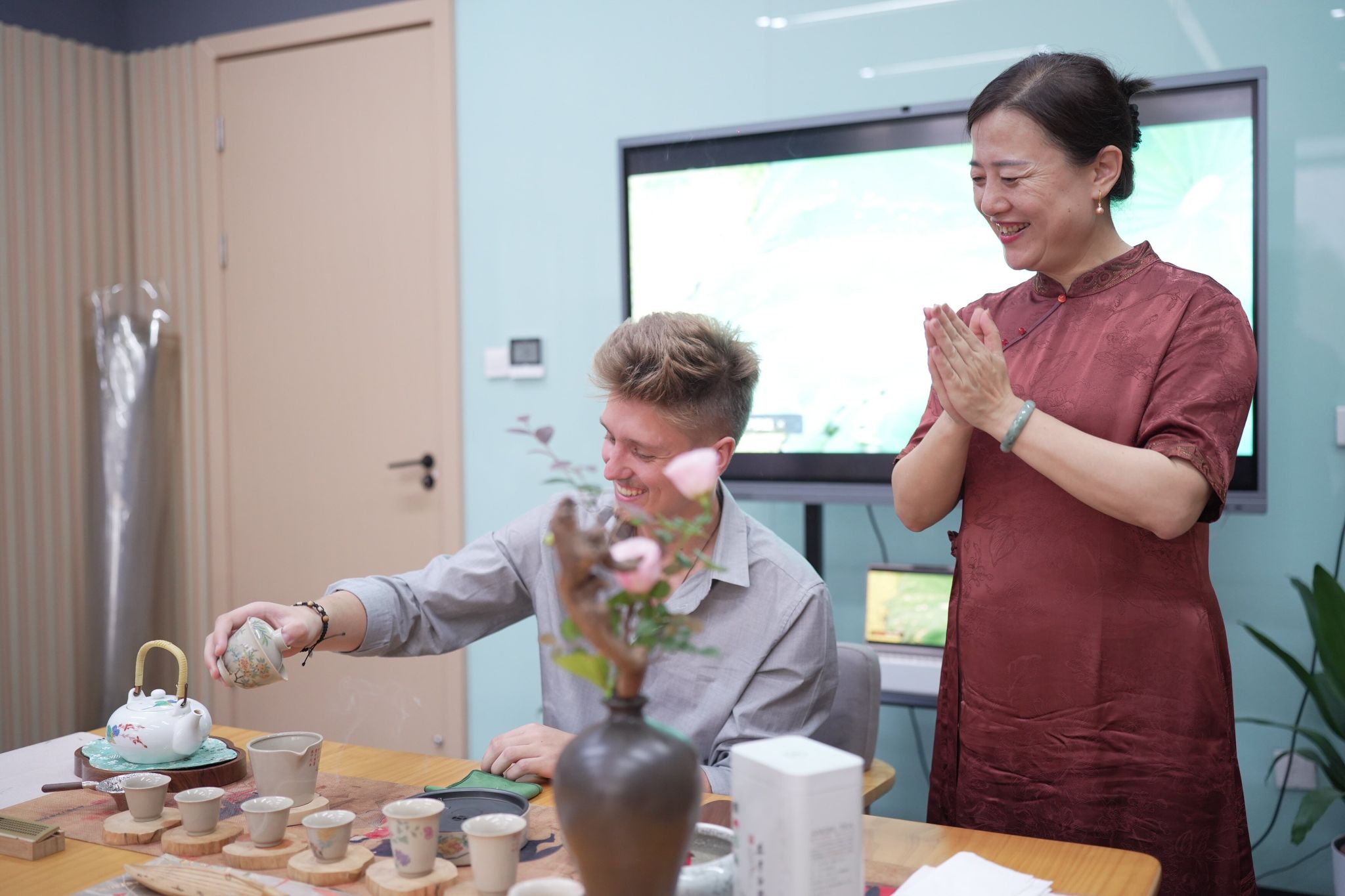 林艳副教授的“茗心雅叙——中国茶道美学与品鉴沙龙”主题讲座以一盏清茶为媒,向学生们介绍了茶道的历史与文化意蕴,并现场展示茶艺。波兰学生亲手尝试泡茶品茗,在茶香氤氲中体悟东方生活美学与“和敬清寂”的精神内涵。