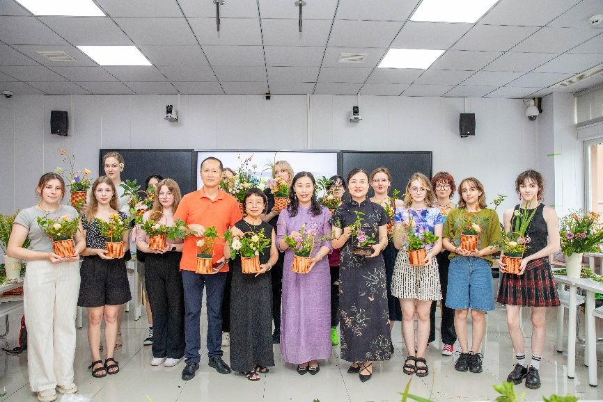 brewing technique and demonstrated the charm of Chinese flower arrangement. Students from both countries created beautiful flower bouquets